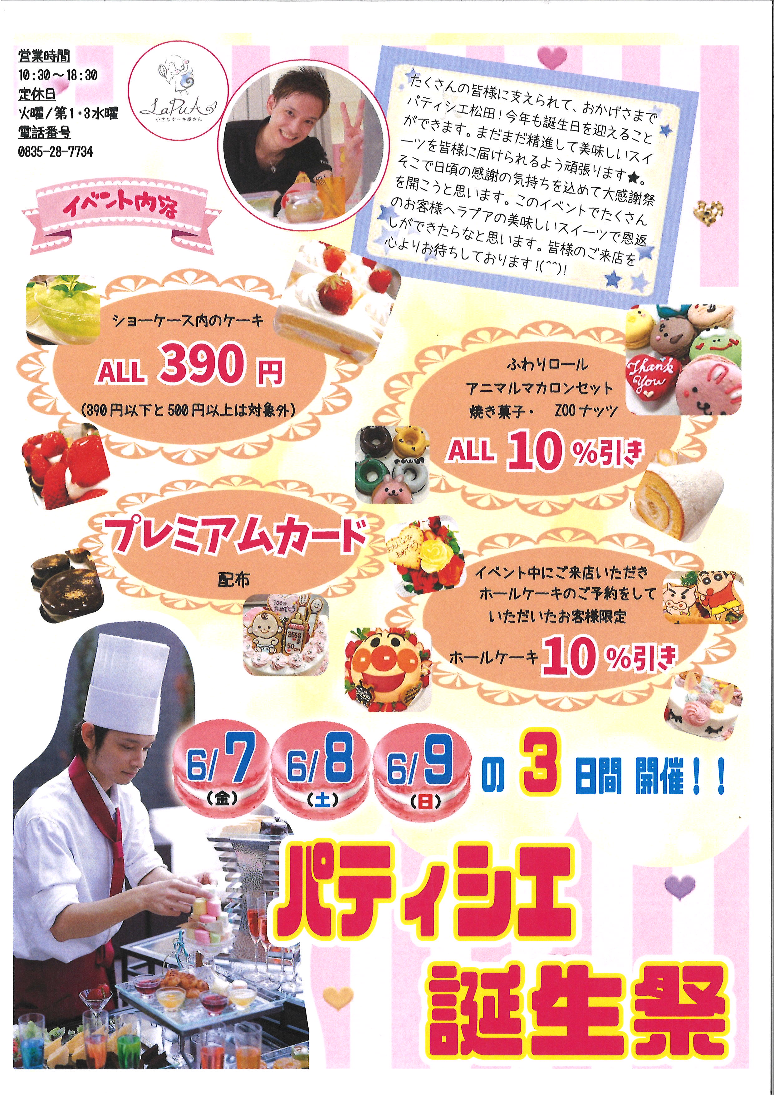 ルルサス1階に店舗をかまえる“La Pu A 小さなケーキ屋さん”で『パティシエ誕生祭』が開催されます!みなさま、是非足をお運びくださいませ。
